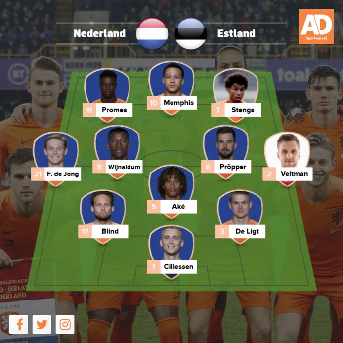 De vermoedelijke opstelling ziet er als volgt uit In de vermoedelijke opstelling is een basisplaats voor calvin stengs en nathan aké. Estland staat laatste in groep c van het kwalificatietoernooi voor het ek. Alle vier wedstrijden gingen tot nu verloren.